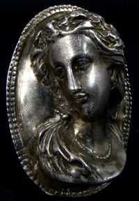 30 - NOUVEAU STERLING SILVER RELIEF BROOCH / PENDANT Art Nouveau sterling silver brooch in deep relief. Depicts the profile of a young lady, similar to a cameo. Can be worn as a pendant or brooch / pin. Measures 2 3/8" length (6cm). Total weight 1.9ozt (60g).