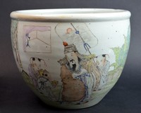 34 - 20th C CHINESE FAMILLE VERTE PORCELAIN FISH BOWL 20th century Chinese Famille Verte porcelain fish bowl / planter. Depicts an elder surrounded by children in a courtyard. Calligraphy markings to verso. Measures 10 1/2" diameter x 7 3/4" height.