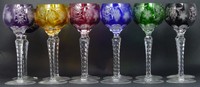 40 - 12pc BOHEMIAN CUT TO CLEAR CORDIALS 12 Bohemian cut-to-clear wine glass cordial goblets each with grape motif. Includes 2 of each ruby glass, cobalt blue, green, amber glass and cranberry glass; 1 each amethyst glass and orange. Each measures 5" (12.7cm) height.