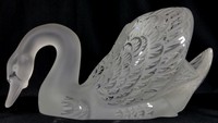41 - LALIQUE FRANCE CRYSTAL SWAN Large Lalique frosted and clear crystal swan in naturalistic swimming form with stylized cut feathers in foraging position with head down. Signed to lower side beneath tail feather. Holds original label to underside. Measures 14" (35.5cm) length.