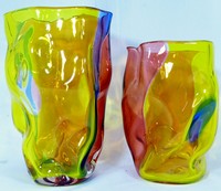 43 - 2pc ARCHIMEDE SEGUSO MURANO ART GLASS VASES 2 Archimede Seguso Murano free form art glass vases. Each with yellows, reds & blues. Each signed to underside. Largest measures 13 1/2" (34cm) height. Smallest measures 10 1/2" (26.5cm) height.