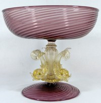 47 - VENETIAN PURPLE & GOLD DOLPHIN GLASS COMPOTE Venetian compote with ribbed purple glass and three gold fleck dolphins to center. Measures 10" (25.5cm) diameter x 8 3/4" (22.5cm) height.