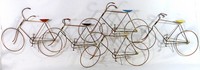 8 - CURTIS JERE COPPER & BRASS BICYCLE WALL SCULPTURE Curtis Jeré for Artisan House mid-century modern copper and brass wall sculpture of bicycles. Signed to gear set of rightmost bicycle. Measures 59 1/2" (151cm) length x 19" (48cm) height. This lot has been relisted due to non-paying bidder Avram Saban from Miami Beach, FL.