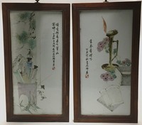 10 - PR CHINESE FAMILLE ROSE PORCELAIN PLAQUES Pair of Chinese Famille Rose porcelain plaques. First depicts a grouping of scrolls. Second depicts flowers and books. Each measures 14" (35.5cm) x 7" (7.8cm).