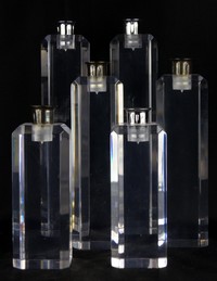 19 - 6pc VINTAGE LUCITE CANDLESTICK HOLDERS 3 pairs of lucite candle sticks of varying sizes, each having faceted design and silver-tone cups. Largest measures 10 5/8" (27cm) height.