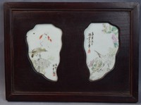 22 - PR CHINESE FAMILLE ROSE LEAF-FORM PORCELAIN PLAQUE Pair of Chinese Famille Rose porcelain plaques in the form of a leaf. Each having depictions of birds and foliage with calligraphy markings. Both mounted in a single frame. Each plaque measures 5 3/4" (14.5cm) x 3 1/2" (8.8cm).