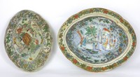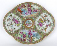 24 - CHINESE ROSE MEDALLION PORCELAIN PLATTER Chinese Rose Medallion scalloped porcelain tray. Two side panels depict figures in courtyard scenes. Two opposing panels and center panel depicts birds, insects and floral branches. Measures 10 7/8" (27.6cm) length.