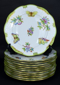 28 - 12pc HEREND QUEEN VICTORIA PORCELAIN SALAD PLATES 12 Herend porcelain salad plated in the Queen Victoria pattern with green border. Each marked to underside and numbered 517 / VBO. Each measures 7 1/2" (19cm) diameter.