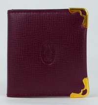 37 - CARTIER PHOTO HOLDER w BOX Cartier burgundy leather photo holder with gilt corner caps. Cartier medallion to center. Includes original box. Photo holder measures 2 5/8" (6.6cm) x 2 1/2" (6.3cm).