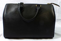 38 - LOUIS VUITTON SPEEDY 30 BLACK EPI LEATHER SATCHEL Louis Vuitton "Speedy 30" handbag in black Epi leather with brass hardware. Monogrammed to corner (front and back) and marked to leather tag. Measures 11" (28cm) length.