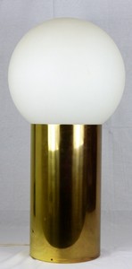 40 - MODERN BRASS TABLE LAMP w ACRYLIC GLOBE Mid-century modern brass table lamp with acrylic globe. Original label to underside. Measures 32" (81cm) height.