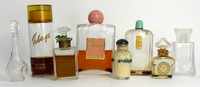 43 - 8pc VINTAGE PERFUME BOTTLES 8 vintage glass and crystal perfume bottles including Coty Styx, Coty, Caron, Guerlain L'Heure Bleue, Shulton Friendship Garden, Evyan White Shoulders Cologne, Faberge Aphrodisia Cologne, and one unknown with RR label (mostly full with faceted stopper). Largest measures 5 7/8" (15cm) height. keyword: lalique