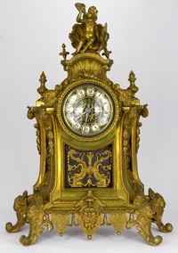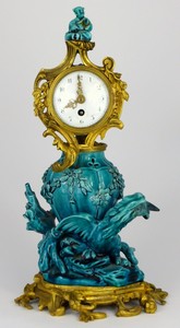 8 - 19th C FRENCH ORMOLU & CHINESE PORCELAIN CLOCK French gilt bronze clock with Chinese turquoise-glazed porcelain. Mythical bird-like beast to body and Chinese figure finial. Measures 12" (30.5cm) height.
