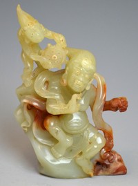 12 - CHINESE CARVED JADE STATUE OF DEITIES Chinese carved jade statue depicting two deities. Measures 6" (15.2cm) height x 4" (10.2cm) width.