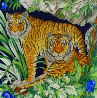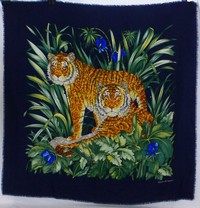 16 - SALVATORE FERRAGAMO SILK & WOOL TIGER SHAWL Salvatore Ferragamo silk and wool shawl depicting two tigers. Signed lower right and holds original tags to verso. Measures 54" (137cm) x 53" (134.5cm).