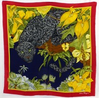 15 - SALVATORE FERRAGAMO SILK BLACK PANTHER SCARF Salvatore Ferragamo silk scarf depicting a floral black panther. Signed lower right. Holds tag lower left. Includes original box. Scarf measures 34" (86.5cm) square.