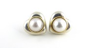 20 - PR TIFFANY STERLING 18kt MABE PEARL HEART EARRINGS Pair of Tiffany & Co sterling silver earrings, each having a mabe pearl set in 18kt yellow gold bezel. Each marked to backside and measures 25mm width. Total weight 23.7g.