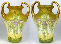 21 - PR RSTK AMPHORA POTTERY VASES Pair of Turn-Teplitz handled pottery vases. Gilt handles with floral Nouveau motif to body. Each marked Turn Teplitz Bohemia, RSTK and impressed Amphora within oval. One vase impressed 660, 60 and initialed FR / NK. Second vase impressed 660 / 47. Measures 8 3/4" tall x 6" handle to handle