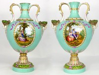 22 - PR FRENCH HANDLED PORCELAIN VASES Pair of French hand painted porcelain vases, each having two maiden-head handles. Each having two hand painted panels with figural scenes. Each impressed 38 and has blue flower to underside. Each measures 13 1/2" (34cm) height.