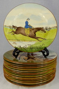 28 - 16pc CAULDON FOX HUNTING COMICAL PLATES 16 Cauldon English bone china plates with comical fox hunt theme. Includes plate numbers 2, 3, 4, 5, 8, 9, 10 (2), 11, 13, 14 (2), 15, 16, 17, 18. Each marked to underside and measures 10 3/8" (26.5cm) diameter.