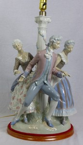 37 - LLADRO 'LA TARANTELA' LARGE FIGURAL PORCELAIN LAMP Lladro porcelain lamp with three large figures dancing around a column. Titled 'La Tarantela' #1124. Marked to underside. Measures 24" + 1 1/4" (3cm) wooden base.