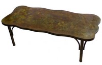 3 - PHILIP & KELVIN LAVERNE COFFEE TABLE Philip and Kelvin Laverne mid-century cocktail table having a scalloped top incised with verdigris floral branches on a burnished metal ground. Signed to top. Measures 54 1/4" (137.8cm) x 23" (58.5cm) x 17" (43cm) height.