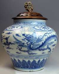 40 - CHINESE BLUE & WHITE PORCELAIN GINGER JAR Chinese blue and white porcelain ginger jar having dragon motif to body. Pierced lid with lingzhi finial. Measures 14" (35.5cm) diameter x 12 1/2" (31cm) height.