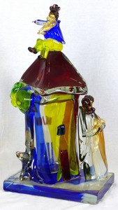 42 - WALTER FURLAN 'CHAGALL' MURANO GLASS SCULPTURE Walter Furlan (Italian, b. 1931) Murano glass sculpture titled 'Omaggio a Chagall'. Depicts a fiddler on the roof of a house with tree to one corner and embracing couple to opposing corner. Signed, titled and holds raised logo to top of base. Inscribed to underside of base. Measures 19 1/2" (49.5cm) height.