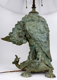 4 - CRAIGHEAD & KINTZ COCKATOO & TURTLE LAMP American patinated metal figural lamp manufactured by Craighead & Kintz Mfg. Co., Massachusetts. Depicts a cockatoo with glass eyes attacking a turtle. Last quarter 19th century. Measures 24 1/4" (61.5cm) height.