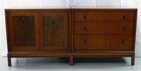 5 - JOHN STUART MID-CENTURY MODERN CREDENZA John Stuart mid-century modern sideboard / credenza. Two doors with shelf and three drawers, each with teardrop shaped pulls. Holds John Stuart plaque to inside of top drawer. Measures 66 1/4" x 19 1/2" x 30 1/4" height.