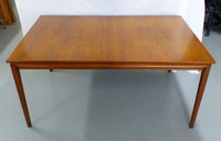 6 - JOHN STUART MID-CENTURY MODERN DINING TABLE John Stuart mid-century modern dining table with two leaves. Holds round John Stuart plaque to underside. Table measures 64" x 42" x 30" height. Each leaf adds an additional 18", opening table to 100".