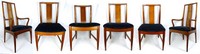 6a - 6pc JOHN STUART MID-CENTURY MODERN CHAIRS Set of 6 John Stuart mid-century modern chairs. Includes two arm chairs with caned back and four side chairs with solid wood back. Each chair holds round John Stuart plaque to underside. Armchairs measure 42" height and side chairs measures 34 1/2" height.