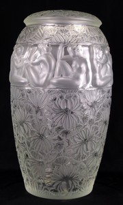 10 - LALIQUE MONUMENTAL 'ANGELIQUE' CRYSTAL VASE Lalique covered French frosted crystal vase depicting flowers and foliage with a band of nude female silhouettes. Silver collar at the rim. Vase and lid signed Lalique France and numbered 169. Measures 21" (53.3cm) height.