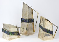 14 - MIGUEL PINEDA ENAMELED SILVER FOOTED BOWL Miguel Pineda Mexican silver plated bowl with Aztec inspired enameled geometric shapes in varying colors. Resting on three tapered feet. Signed to side. Measures 7 1/4" (18.5cm) diameter.