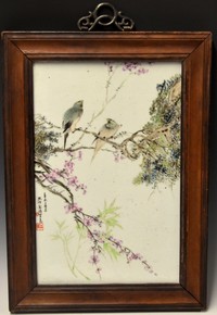 16 - CHINESE FAMILLE ROSE PORCELAIN PLAQUE Chinese Famille Rose porcelain plaque depicting two birds perched on a floral branch. Signed and holds calligraphy lower left. Porcelain plaque measures 15 1/2" (39.3cm) x 10" (25.5cm).