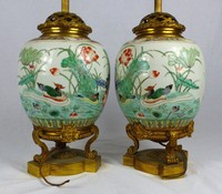 17 - PR CHINESE FAMILLE VERTE PORCELAIN JARS Pair of Chinese Famille Verte porcelain jars with French bronze mounts. Each having depictions of flowers, birds and insects. Each porcelain jar measures approx 7 1/2" (19cm) height. Each lamp measures 26 1/2" (67cm) overall.