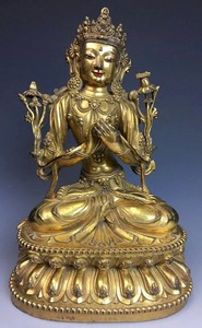 18 - CHINESE GOLD GILT BRONZE BUDDHA FIGURE Chinese gold gilt bronze Bodhisattva Buddha statue having ornate headdress, floral earrings and beaded jewelry. Seated in the Lotus position upon double lotus throne. Hands in the Dharmachakra Mudra gesture of teaching. Holds calligraphy characters to side of base. Measures 9 1/4" (23.5cm) height.