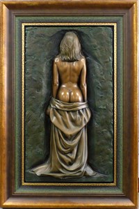 1 - BILL MACK 'BRILLIANCE' NUDE FEMALE SCULPTURE Bill Mack, (American, b. 1949) bonded bronze sculpture depicting a nude female with lowered robe. Signed upper left. Measures 43" (109cm) x 24 1/4" (61.5cm) + 7 1/4" (18.5cm) frame.