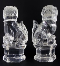 20 - PR CHINESE CARVED ROCK CRYSTAL FOO DOGS Pair of Chinese carved clear quartz foo lions. Each seated atop a hexagonal base. Each measures 11 1/2" (29cm) height.