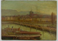 22 - CHRISTIANE DE PREVAL 'GENEVE' OIL PAINTING CANVAS Christiane de Preval (French, b. 1876) oil painting depicting a landscape scene with bridge in Geneva. Signed lower left. Titled Geneve and dated 1925 to verso. Measures 18" (45.7cm) x 13" (33cm).