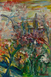 24 - DAVID BURLIUK 'CENTRAL PARK' OIL PAINTING ON BOARD Oil painting on masonite depicting a view of Central Park, New York attributed to David Davidovich Burliuk (Russian/American,1882-1967). Signed lower right. Measures 18 1/4" (46.3cm) x 12 3/8" (31.5cm).