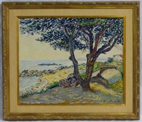 25 - PIERRE PHILIPPE BERTRAND OIL PAINTING ON CANVAS Pierre Philippe Bertrand (French, 1884-1975) oil painting on canvas depicting a coastal landscape. Titled 'Sur le Chemin Cotier'. Signed lower right. Measures 25" (63.5cm) x 21" (53.3m) + 4" (10cm) mat & frame.