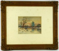 26 - JULIUS VON KLEVER WATERCOLOR ON PAPER Julius Yulevich Von Klever (Russian, 1850-1924) watercolor on paper depicting a winter landscape. Signed lower left. Measures 7" (17.8cm) x 5 1/4" (13.3cm) + 5" (12.7cm) mat & frame.