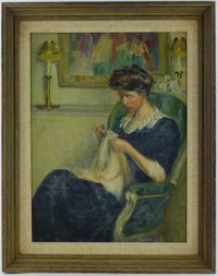 28 - RICHARD EDWARD MILLER OIL PAINTING ON BOARD Oil painting on board depicting a seated woman attributed to Richard Edward Emil Miller (American, 1875-1943). Measures 15 1/4" (38.7cm) x 11 3/8" (29cm) + 2" (5cm) frame.