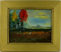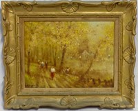 35 - FRANCIS DARBY DAVIS OIL PAINTING ON CANVAS Francis Darby Davis (American, b. 1925) oil painting on canvas depicting an autumn landscape with figures. Signed lower left. Measures 14 1/2" (36.7cm) x 11 1/2" (29cm) + 3 1/2" (8.8cm) frame.