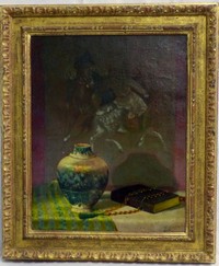 32 - HARRY DIRIT 'CHINESE POLO PLAYERS' OIL / CANVAS Harry Dirit (European, 20th Century) oil painting on canvas depicting a vase and book with two Chinese polo players in the background. Signed lower right. Measures 18 1/2" (47cm) x 14 3/4" (37.5cm) + 3" (7.5cm) mat & frame.