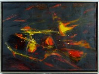 33 - THOMAS GEORGE 'FIRE FRAGMENTS' OIL ON CANVAS Thomas George (American, 1918 - 2014) oil painting on canvas. Signed, titled 'Fire Fragments' and dated 1954 to verso. Measures 21" (53.3cm) x 15" (38cm) + 1/2" (1.2cm) frame.