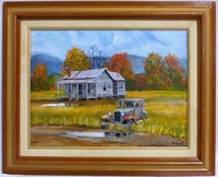 34 - HERBERT WEINTRAUB PAINTING ON BOARD LANDSCAPE Herbert Weintraub (American, 20th century) acrylic painting on board depicting a New York homestead. Signed lower right. Measures 15 1/2" (39.3cm) x 11 3/4" (30cm) + 2 3/4" (7cm) frame.