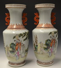 39 - PR CHINESE FAMILLE ROSE PORCELAIN VASES Pair of Chinese Famille Rose porcelain vases with dragon handles. Each depicts figures in a courtyard with landscape scene and calligraphy to verso. Each marked to underside and measures 20" (50.8cm) height.