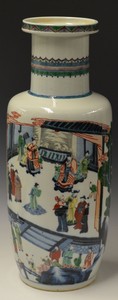 40 - CHINESE DOUCAI PORCELAIN ROULEAU VASE Chinese Doucai porcelain vase of Rouleau form depicting various figures and a landscape scene. Blue double circle mark to underside. Measures 19 1/4" (48.8cm) height.